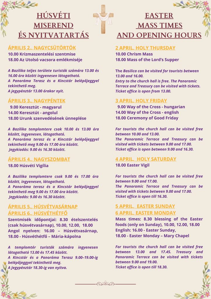 Szentmisék időpontjai: 8.30 ételszentelés (csak húsvétvasárnap), 10.00, 12.00,  18.00